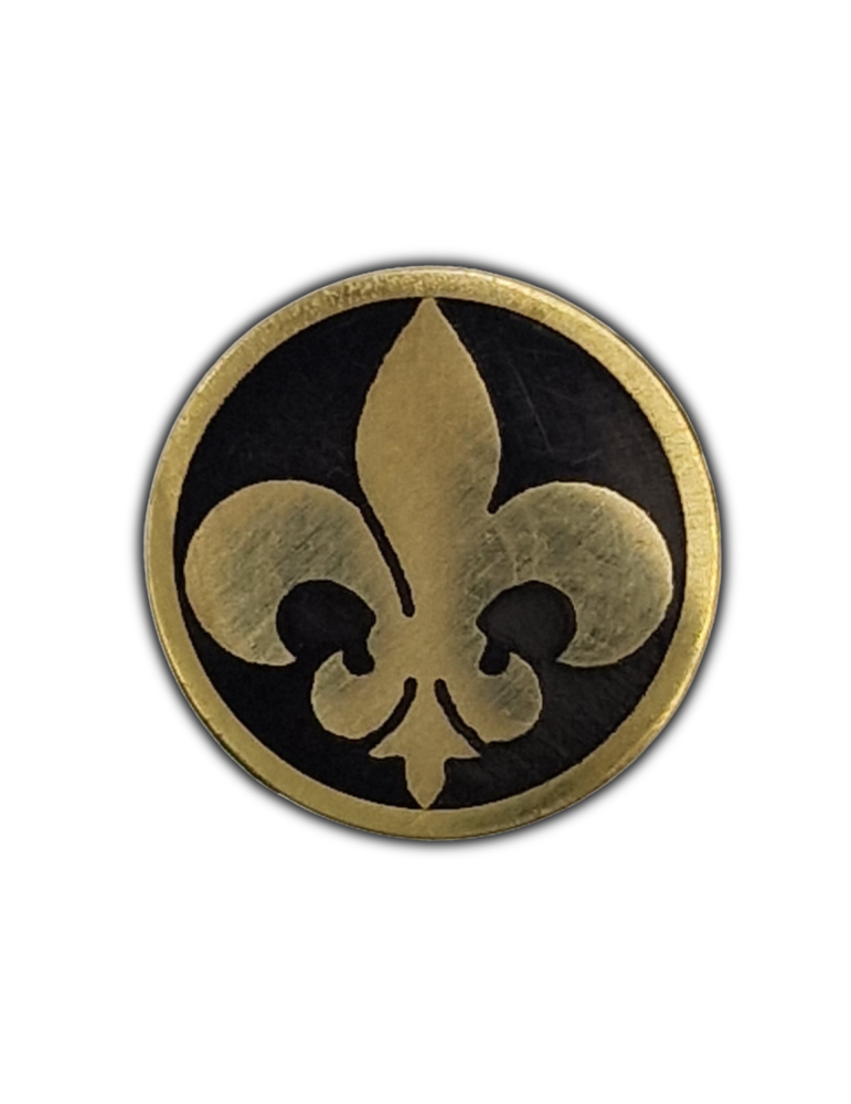 A kép kitűzők, más néven díszes kés kitűzők, kis fém darabok, melyek a markolatot a pengéhez rögzítik. Szerkezeti funkciójuk mellett esztétikai szerepet is betöltenek, egyedi megjelenést adva minden késnek. A felajánlott "Fleur-de-lis" kép kitűző sárgarézből és epoxi gyantából készült.